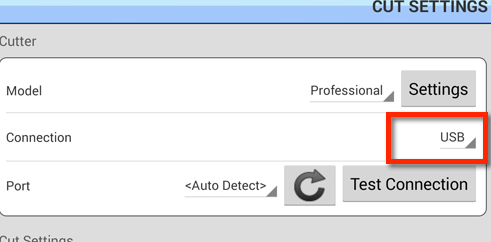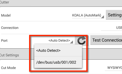 Then from the Port drop down, it should list the Cutter, similar to the image shown below. As we are only connecting a single Cutter to the tablet, you can leave it on <Auto Detect> or choose the actual port it is detected on.
