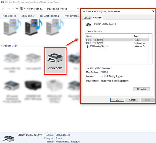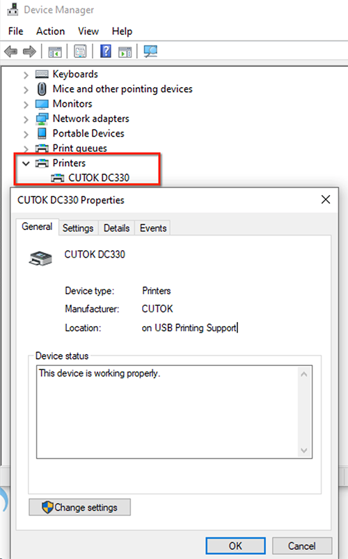 If you open the Device Manager in Windows, you should see an entry in the Printers section for a CUTOK printer. If you double click to get Properties on the printer, it should also indicate that the device is working properly in the Device status.
