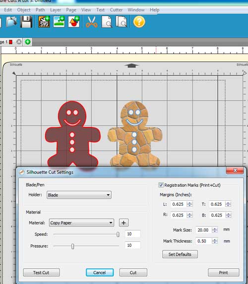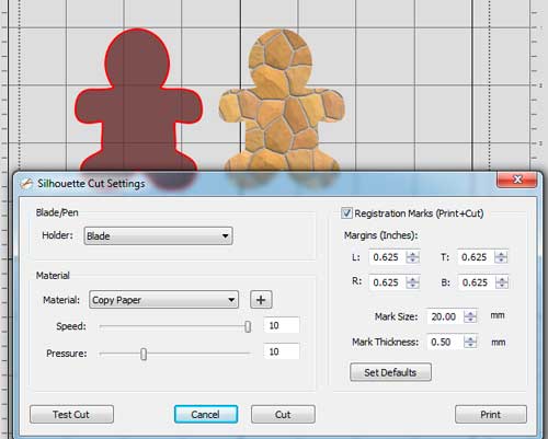 5. Choose Cut to bring up the Sihouette Cut Settings window again. Keep the Registration Marks checkbox checked, so that when you hit the Cut button, it will inform the Silhouette to look for those registration marks on the printed paper before it actually starts to cut the outline.