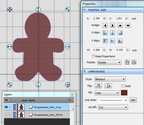 Now it is time to cut the printed paper with your Silhouette. This example will assume you do not want to cut out the holes where the eyes, mouth and buttons are, so we will hide or remove those outlines so they don't get cut. Whatever outline is shown on the mat, is what will get cut, so in this example, it will only cut the outer outline of the gingerbread man.