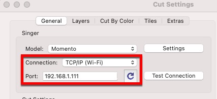 In the Cut window in Sure Cuts A Lot, set the Connection to TCP/IP (Wi-Fi) and then for the Port, type in the IP address shown on the Singer Momento display.