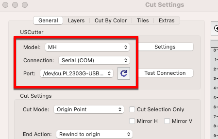 In the Cut window, set the Model to MH, the Connection to Serial (COM) and the Port to what your Mac assigns to the adapter connection to the MH-MK2. It should look something similar to /dev/cu.PL2303G-USBtoUART110